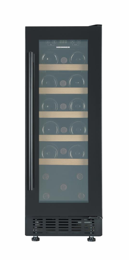 Racitor de vinuri incorporabil Heinner HRV-ABI56DRL20, clasa energetica: G, capacitate totala: 56L, capacitate incarcare: 20 sticle (750ml), o zona de temperatura, interval de temperatura: 5~20°C, display LED, control electronic, lumina LED, 5 rafturi din lemn, blocare acces copii, usa reversibila, dimensiuni (LxAxI): 29.5 x 57 x 82 cm, culoare: Negru