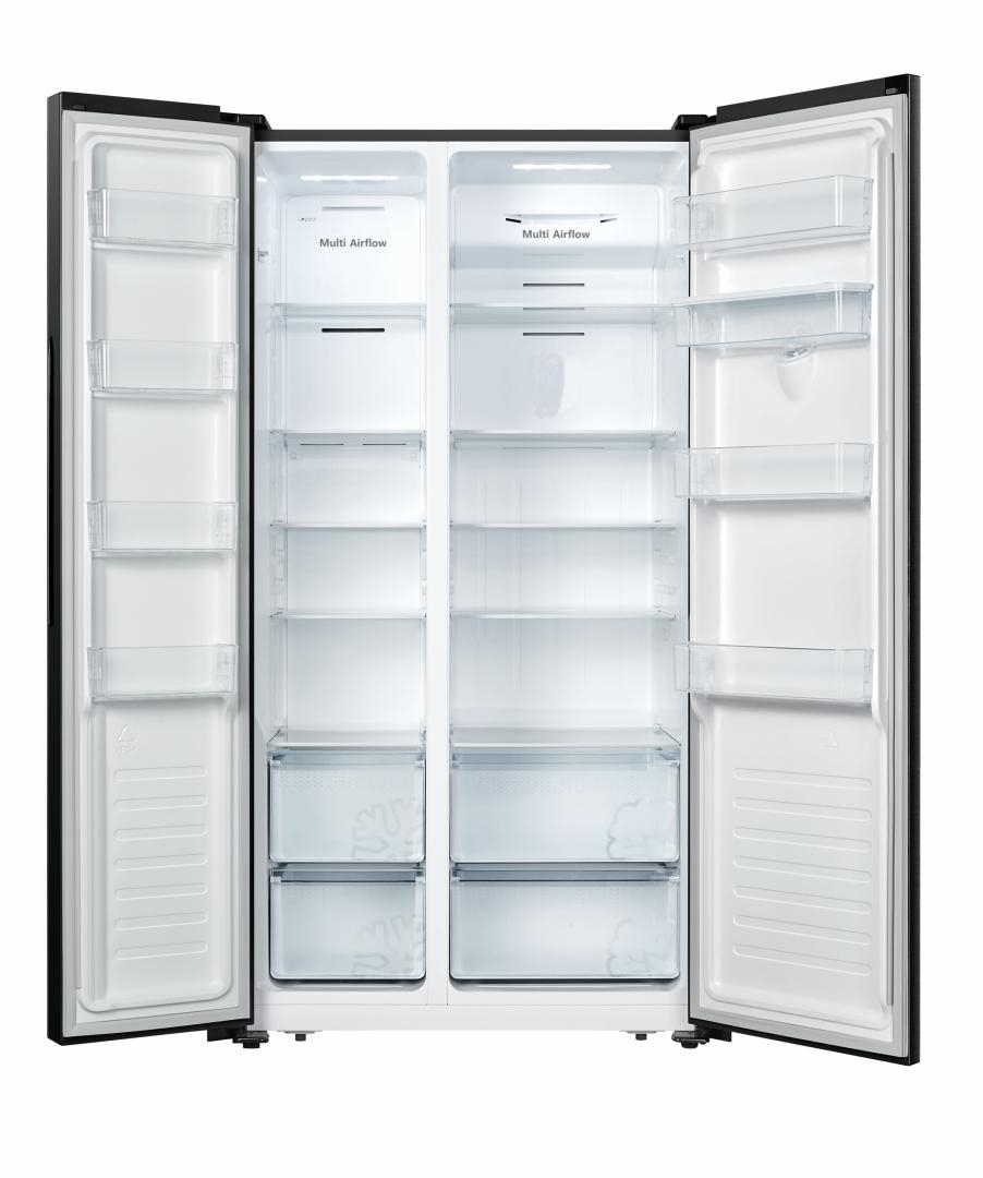 Side by side Heinner HSBS-HS519NFBKWDE++, Full No Frost, sistem “Multi Air-Flowâ€, compresor Inverter, clasa energetica: E, dozator de apa, display LED cu control touch, capacitate totala: 519L, capacitate frigider: 334L, capacitate congelator: 185L, lumina LED, functie Super congelare, functie “Inteligenta artificialaâ€, alarma usa deschisa, blocare acces copii, 4 rafturi din sticla frigider, 2 compartimente pentru fructe si legume, 4 rafturi congelator, 2 sertare congelator, capacitate dozator de apa: 3L, dimensiuni (WxDxH): 91 x 64.3 x 178.6 cm, culoare: Negru