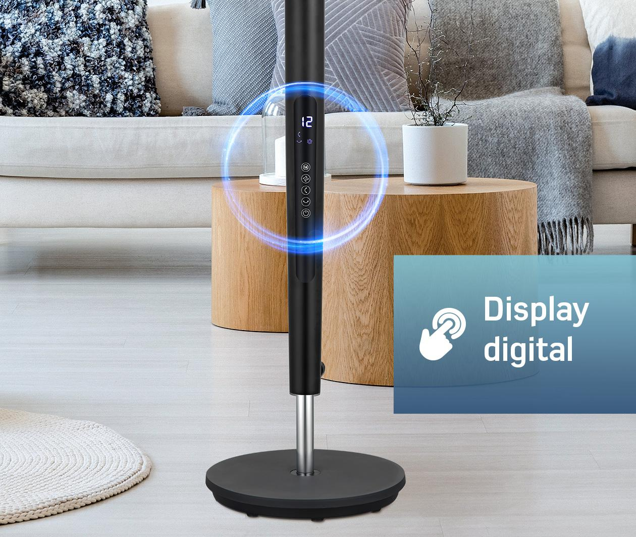 Ventilator cu picior HEINNER HSF-MAT24DC-GY, compartiment aromaterapie, 5 palete, functie TURBO, 12 trepte de viteza, motor DC, timer 12h, display LED, control tactil, telecomanda, 3 moduri: TURBO/normal/noapte; oscilare stanga-dreapta 30-60-120°, oscilare sus-jos 30-60-135°, putere 20W, inaltime 112 cm, gri