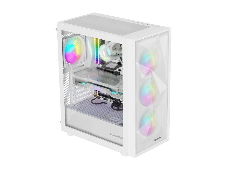 Carcasa GENESIS DIAXID 605 Mid Tower ARGB ALB, Tempered Glass, Sloturi Expansiune 7, Drive Bays: 2x3.5" 3x2.5", Ventilatoare Suportate: 8 (spate: 1x120mm, fata: 3x120mm sau 3x140mm, sus: 2x120mm sau 2x140mm, jos: 2x120mm), Ventilatoare Incluse: 4 (spate: 1x120mm, fata: 3x120mm), Format Placa De Baza Suportat: Mini-ITX, Micro-ATX, ATX, Lungime Maxima Placa Video: 351mm, Inaltime Maxima Cooler Procesor: 168mm