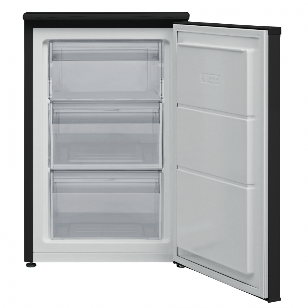 Congelator Heinner HFF-V102BKE++, clasa energetica: E, capacitate totala: 103L, control mecanic cu termostat ajustabil, 3 compartimente congelator, usa reversibila, capacitate congelare: 5.2kg/ 24h, dimensiuni (WxDxH): 54 x 61.5 x 83.8 cm, culoare: Negru cu decoratiune cromata pe maner