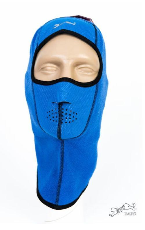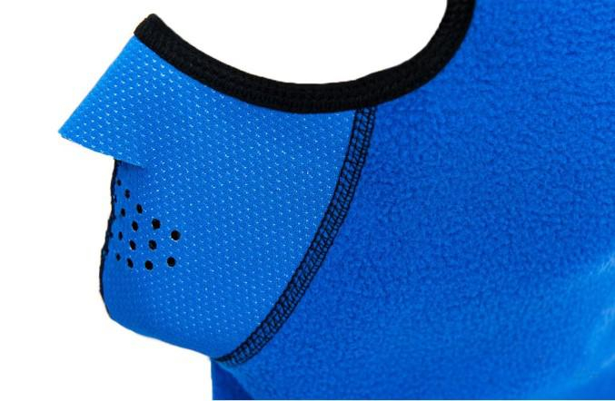 Cagula calduroasa, ce lasa pielea sa respire, perforata la gura si nas pentru a respira mai bine, culoare albastru, material fleece(polar) poliester si membrana windstopper in partea din fata si frunte