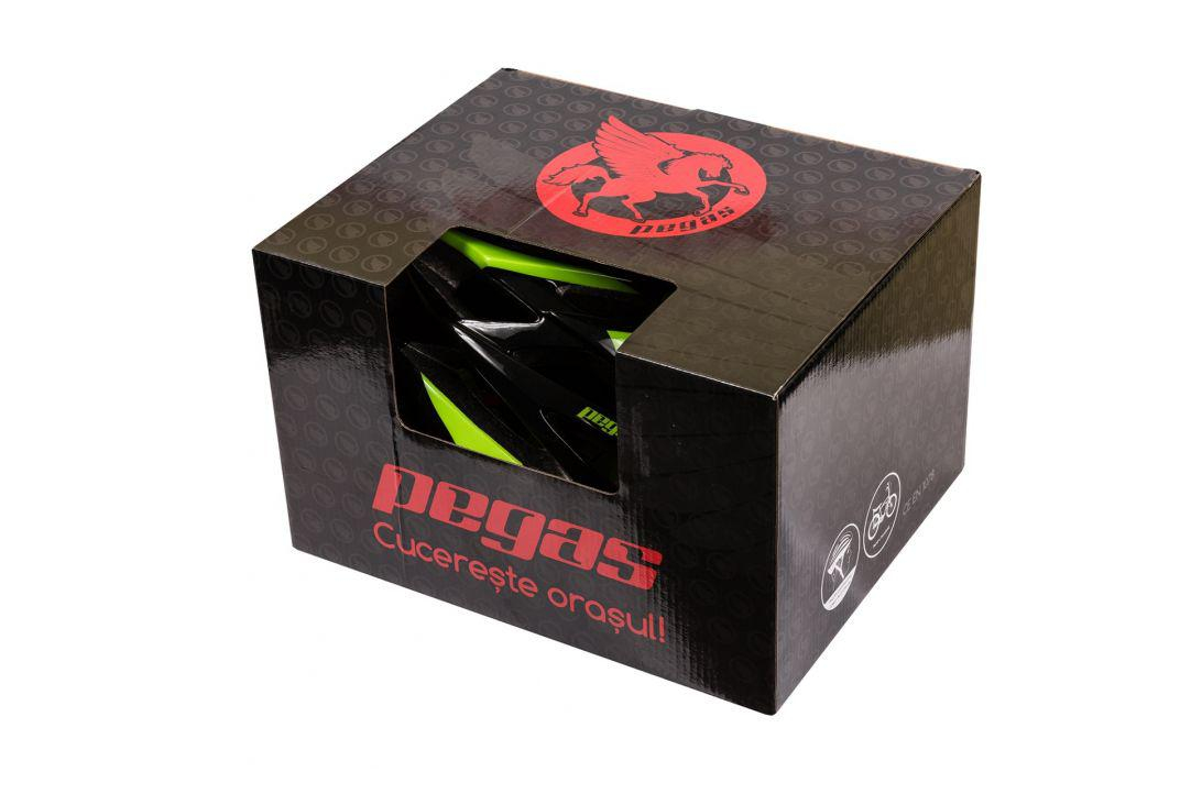 Casca Pegas Omu, material PC+EPS, tehnologie In Mold, ventilatie 21 de gauri, reglaj circumferinta cap, marime L (58-62), culoare Gri + Verde, lucios