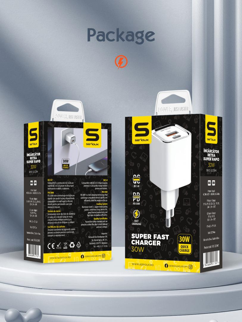 Incarcator retea Serioux 30W Quick Charge, Intrare AC100-240V~ 50/60Hz 0.7A Max, PD Ieșire: 5V-3A, 9V-3A, 12V-2.5A, 15V 2A, 20V=1.5A (30W), QC Ieșire: 5V-3A, 9V-2A, 12V=1.5A (18W), PD+QC=5V=3.6A, Total: 30W Max