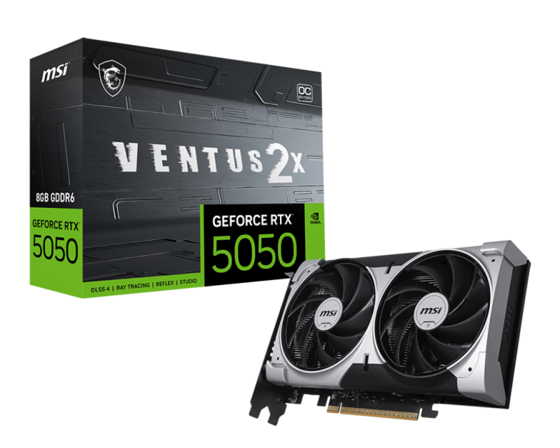 MSI GEFORCE RTX 5050 8G VENTUS 2X OC. Graphics processor family: NVIDIA, Graphics processor: GeForce RTX 5050. Discrete graphics card memory: 8 GB, Graphics card memory type: GDDR6, Memory bus: 128 bit. Maximum resolution: 7680 x 4320 pixels. DirectX version: 12 Ultimate, OpenGL version: 4.6. Interface type: PCI Express x16 5.0. Cooling type: Active, Number of fans: 2 fan(s)