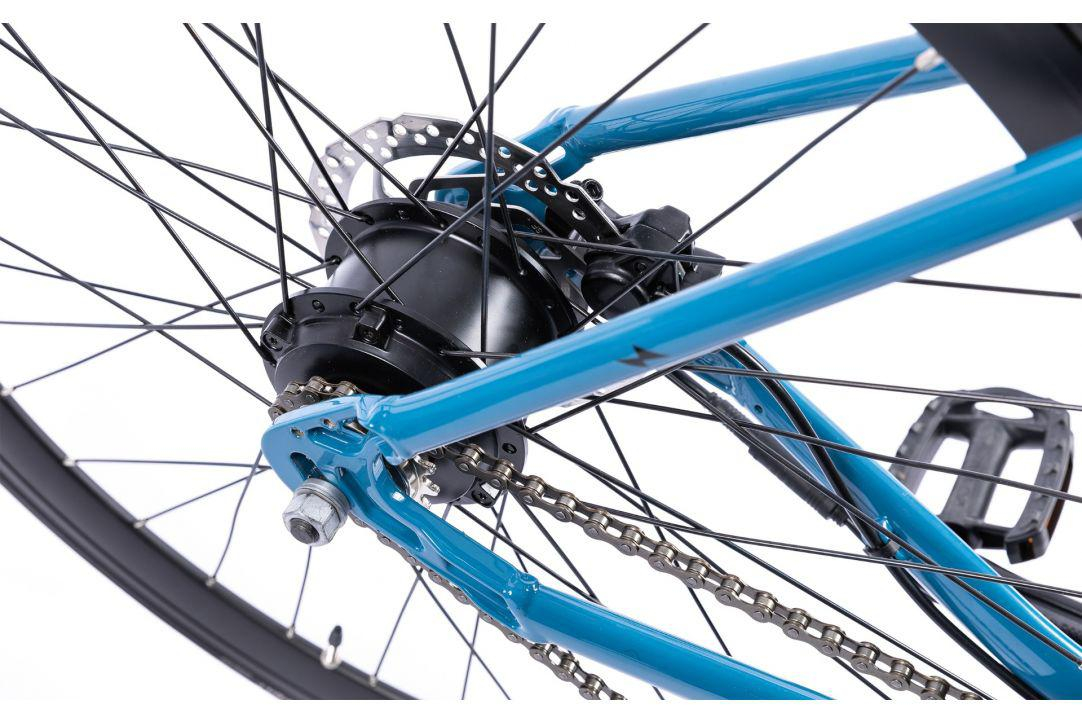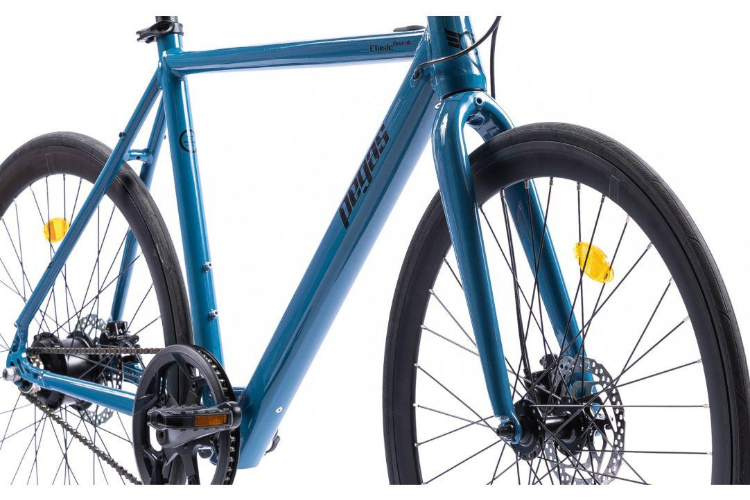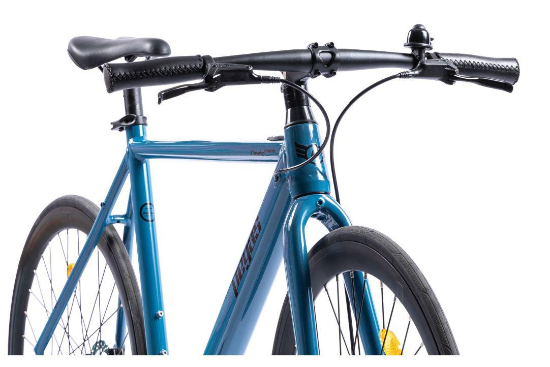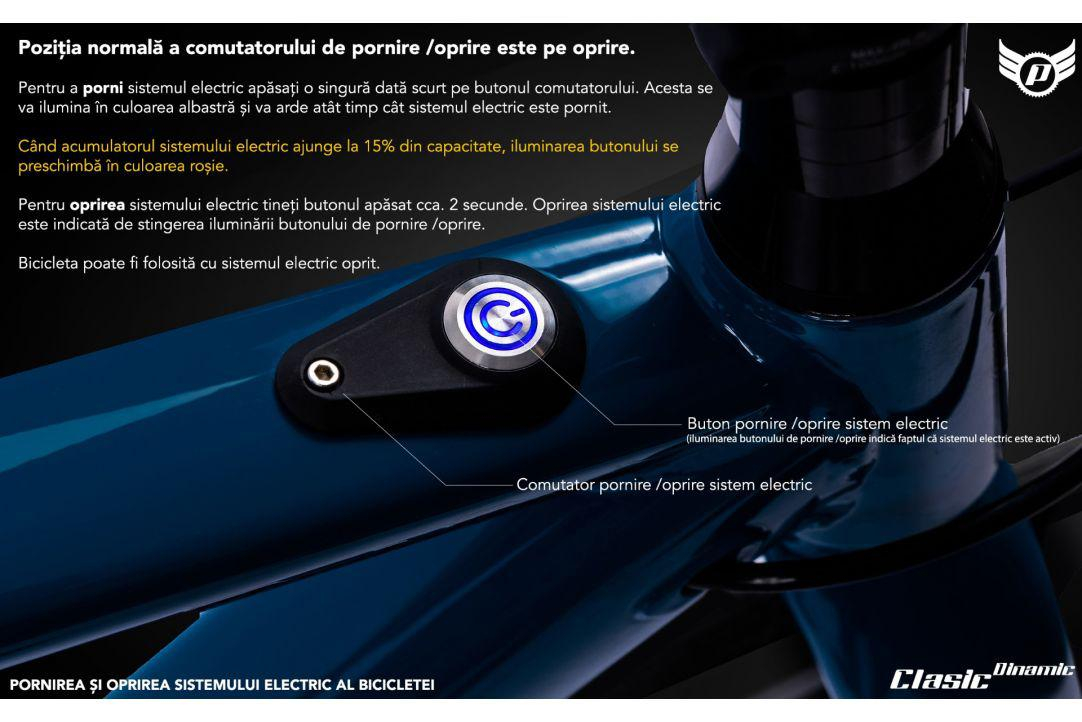 Fă ce vrei cu timpul tău, dar nu-l pierde în trafic. Bicicleta Clasic a evoluat È™i s-a transformat într-un veritabil â€laser†cu care să â€tai†oraÈ™ul atunci când ai nevoie. Am păstrat energia È™i feeling-ul bicicletelor single speed, însă am adăugat un motor pe butucul din spate pentru asistare pentru ca tu să călătoreÈ™ti într-o notă modernă È™i relevantă. Acumulatorul de 281 Wh (36 V/ 7,8 Ah) îți conferă suficientă autonomie cât să faci două drumuri lungi (un mers la serviciu È™i retur, de exemplu) în oraÈ™ul tău. De altfel, pentru a păstra linia unui clasic, acumulatorul este total integrat în cadru. Transmisia cu o singură viteză, cu foaie de 52 de dinÈ›i È™i pinion de 16 dinÈ›i, este una echilibrată È™i făcută special să ai suficientă forță de demarare, dar să È™i prinzi viteză atunci când trebuie. Motorul vine de la Etrotek este de 36V È™i dezvoltă o putere de 250W. Pentru siguranÈ›a ta, am dotat clasicul Dinamic cu frâne puternice hidraulice de la Tektro. Și fiindcă am vrut ca totul să fie cât mai simplu ca tu să te concentrezi numai la drumul pe care-l ai de făcut, sistemul de pornire electric se face dintr-un singur buton de pornire /oprire. Mai mult, tot acesta îți va indica, prin iluminare, când capacitatea acumulatorului a ajuns la 15%. Fără cifre, fără date, fără display-uri. Doar tu È™i drumul!