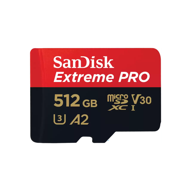 SanDisk Extreme PRO. Capacity: 512 GB, Flash card type: MicroSDXC, Flash memory class: Class 10, Internal memory type: UHS-I, Read speed: 200 MB/s, Write speed: 140 MB/s, UHS Speed Class: Class 3 (U3), Video Speed Class: V30. Protection features: Shock resistant, Temperature proof, Water resistant, X-ray proof, Product colour: Black, Red