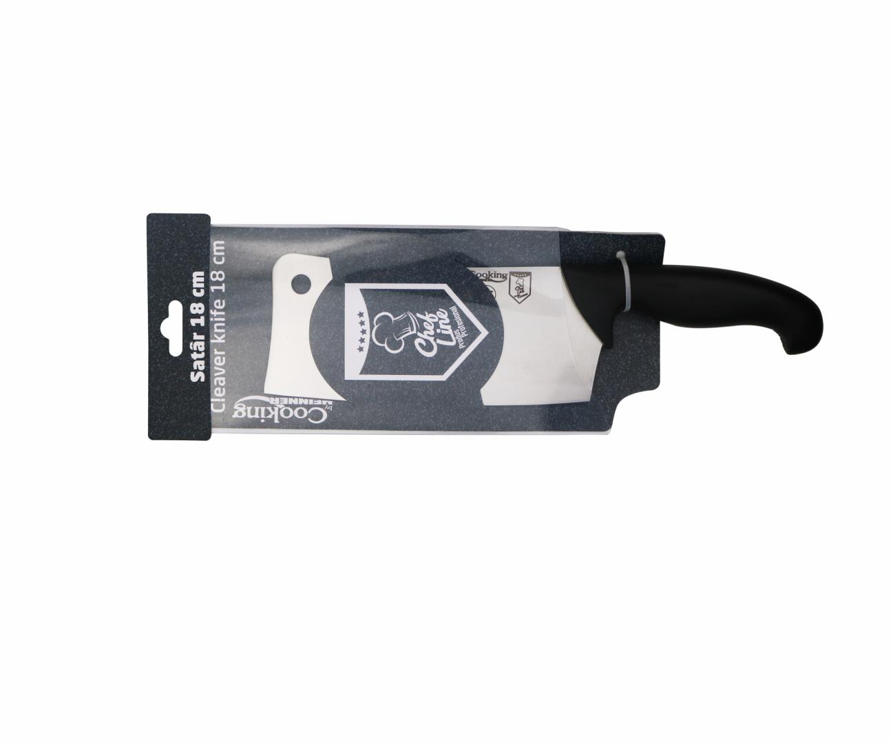 Cleaver knife 18 cm, Black handleTotal length: 30 cmBlade size: 18 cmMaterial: polypropylene handle + stainless steel bladeThickness: 2.5mm