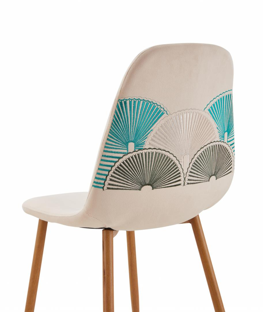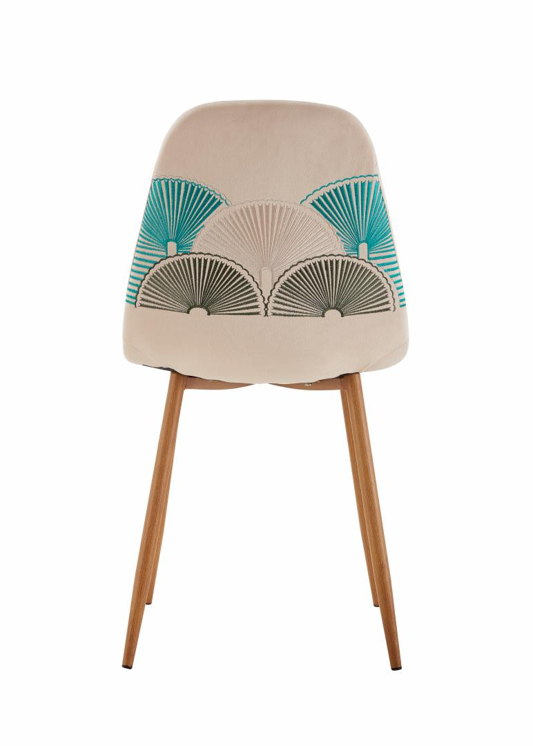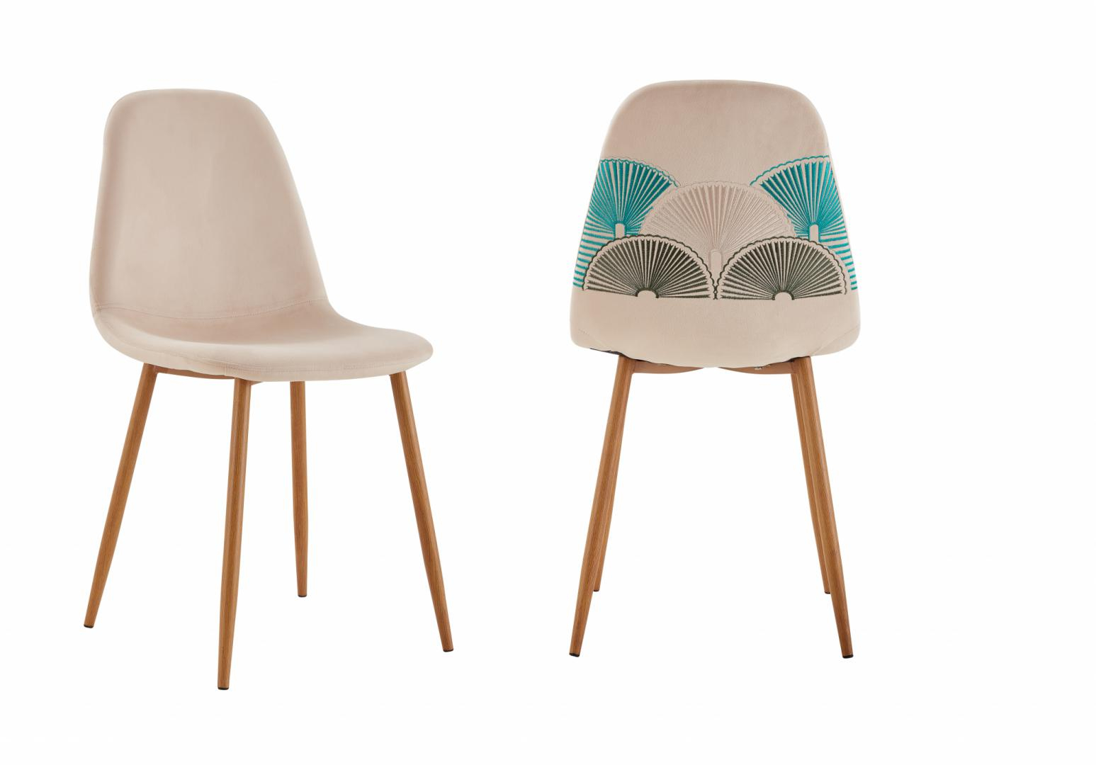 Set 2 scaune dining catifea cu model brodat Bej Dimensiuni scaun : 48x46x87 cm Adancime sezut: 38 cm/Inaltime sezut 47 cm Material : picioare din metal cu aspect de lemn, sezut din plastic imbracat in tapiterie din catifea cu model brodat pe spate. Umplutura din spuma Greutate maxima suportata 120kg