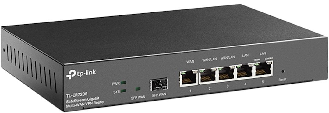 Router TP-Link TL-ER7206, Standarde si protocoale: IEEE 802.3, 802.3u, 802.3ab, interfata: 1x Fixed Gigabit SFP WAN Port, 1x Fixed Gigabit RJ45 WAN Port, 2x Fixed Gigabit RJ45 LAN Ports, 2x Changeable Gigabit RJ45 WAN/LAN Ports, flash: SPI 4MB + NAND 128MB, DRAM 512MB.