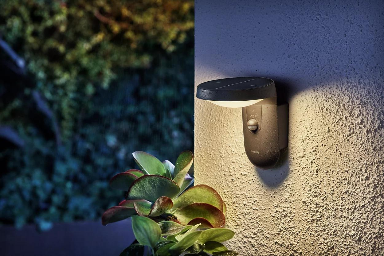 Aplica LED solara pentru exterior cu senzor de lumina si miscare Philips Tyla, 1.2W, 4V, 255 lm, lumina calda (3000K), IP44, 188x158x184mm, Antracit