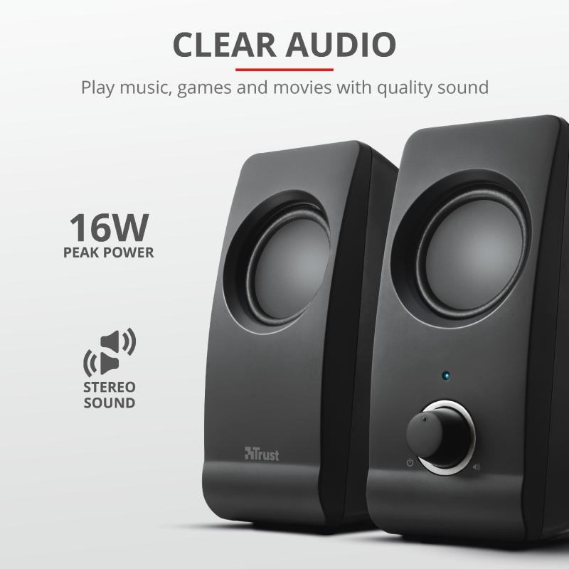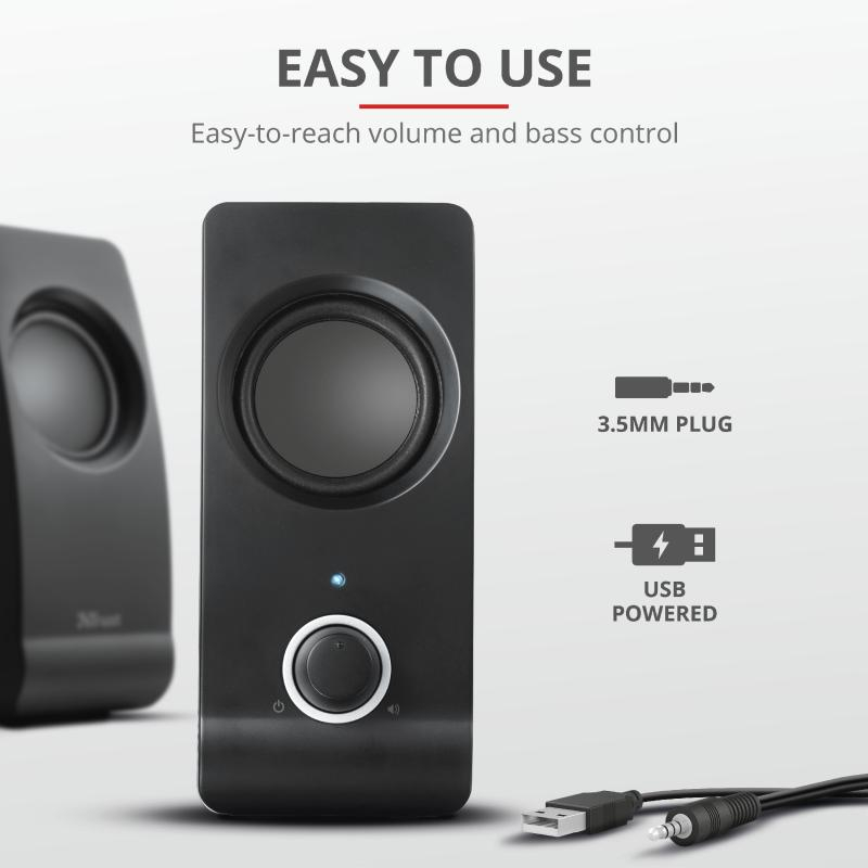 Boxe Stereo Trust Remo 2.0 Speaker Set Specifications General Type of speaker 2.0 Height of main product (in mm) 175 mm Width of main product (in mm) 80 mm Depth of main product (in mm) 80 mm Total weight 600 g Connectivity Connection type wired Cable length power cable 150 cm Cable length audio cable 150 cm Cable length satellite cable 100 cm Bluetooth no Cables included Fixed on speaker Audio Driver size 60 mm Driver units 2 Speaker impedance 4 Ohm Audio input 3.5 mm Input impedance 10000 Ohm Audio output None Headphone connection no Microphone built-in no Microphone connection no Power output (peak) 16 W Power output (RMS) 8 W Frequency response 50 Hz - 20000 Hz Features NFC no Hands-free phone calls no Tripod mount no Power saving no Lighting Lights no Protection Waterproof no Power Power cable detachable no Input Power source USB Compatibility Compatible Device Types pc, laptop Compatible Consoles no General compatibility PC with 3.5mm audio output and USB port Control Controls volume, on/off Remote control no Satellites Satellite Height (mm) 175 mm Satellite Width (mm) 80 mm Satellite Depth (mm) 80 mm Satellite Weight (gr) 300 gr https://www.trust.com/en/product/17595-remo-2-0-speaker-set
